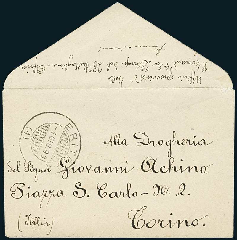 ERITREA (1). Bustina in franchigia per Torino, recante il bollo “Eritrea/(1) – 4 giu. 1896” (p. RR). Al verso manoscritto “Ufficio sprovvisto di bollo. Il Comandante la 2a Comp. Del 28° Battaglione Africa” situata nella piana del Gurà. Rarissima, illustrata sul volume AISP a pag. 269. Ex Bianchi.