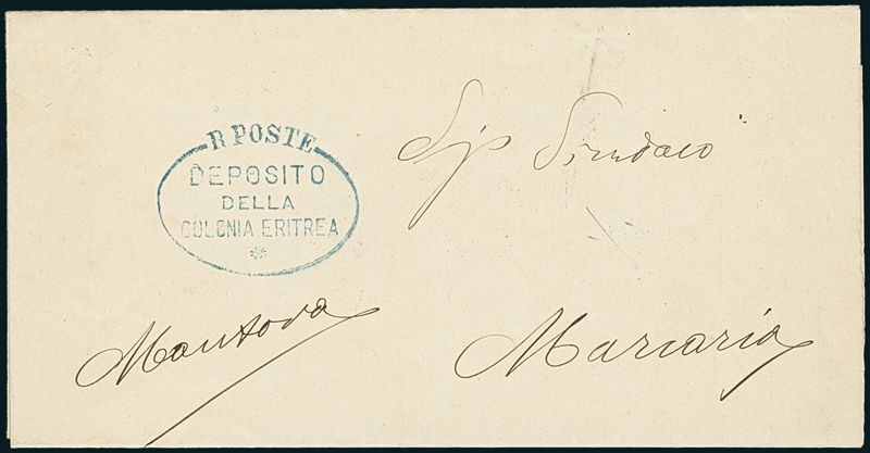 DEPOSITO DELLA COLONIA ERITREA. Lettera in franchigia da Napoli del 25 settembre 1896 per Marcaria, bollo dell’Ufficio “Deposito della Colonia Eritrea-Napoli” al verso e ovale sul frontespizio, entrambi in azzurro. Non comune.