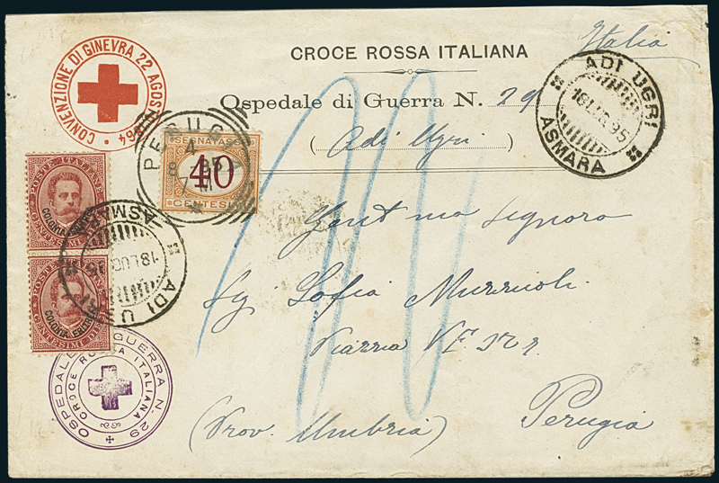 1895, busta intestata “Croce Rossa Italiana – Ospedale di Guerra N. 29”, distaccamento di Adi Ugri, affrancata con coppia verticale del 10c. (4), annullata dal dal timbro “Adi Ugri/Asmara – 18 luglio 1895”, diretta a Perugia. All’arrivo fu tassata per 40c. con segnatasse d’Italia (24). Bollo amministrativo in violetto dell’ospedale, bollo di arrivo a Perugia al verso. Rara e interessante.