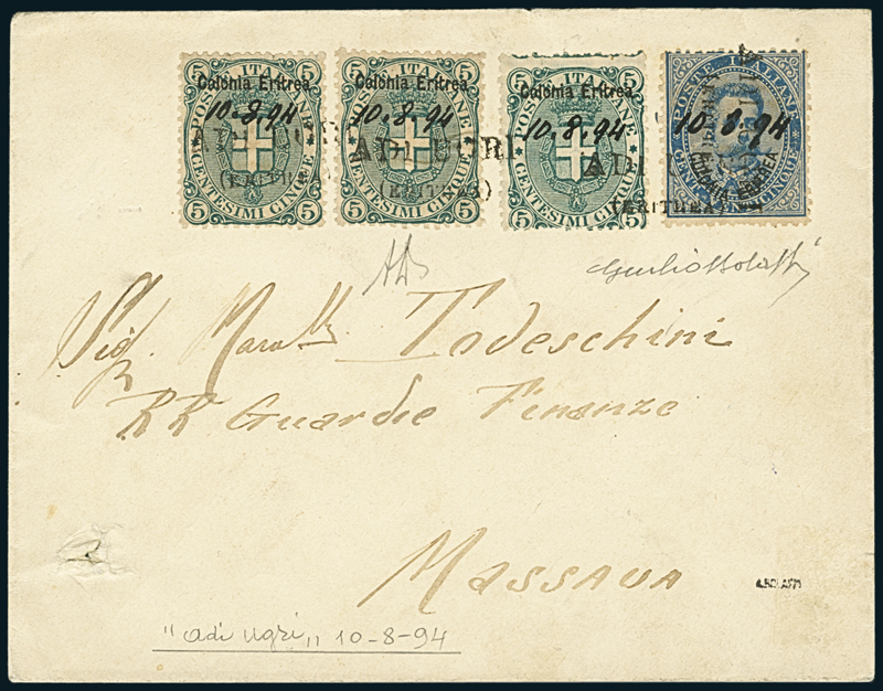 ADI UGRI (ERITREA). Busta affrancata con tre es. del 5c. e un 25c. (3, 6), annullati dal timbro lineare con data manoscritta “Adi Ugri (Eritrea) – 10-8.94” (p. RR) ripetuto tre volte in orizzontale e una in verticale, diretta a Massaua. Riprodotta sul Volume AISP a pag. 99. Grande rarità delle Colonie Italiane, è nota solo un’altra lettera affrancata con 10c. Cert. Alberto Diena (1968) e Giulio Bolaffi (1968).