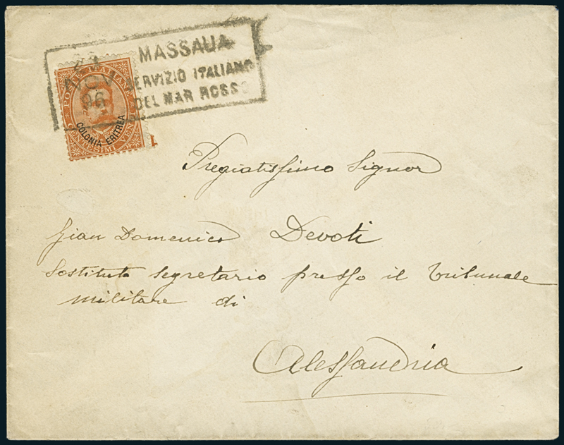MASSAUA/SERVIZIO ITALIANO/DEL MAR ROSSO. Su busta per Alessandria del 23 novembre 1896, annullatore di 20c. di Eritrea (39) lievi difetti su due punti della dentellatura. Al verso bel sigillo a stampa del “Tribunale Militare del Governo dell’Eritrea” e stemma.