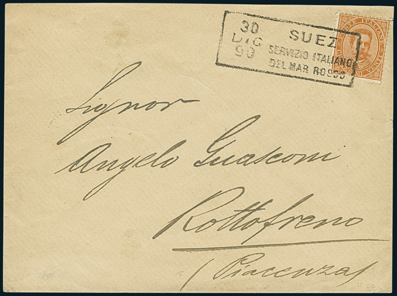 SUEZ/SERVIZIO ITALIANO DEL MAR ROSSO. Su busta del 30 dicembre 1890 per Rottofreno (PC), annullatore di 20c. d’Italia (39) con difetto di dentellatura in basso. Il bollo di transito al verso di Brindisi del 3 gennaio 1891 indica che il piroscafo che effettuò il trasporto era di nazionalità inglese. Raro. Fiecchi