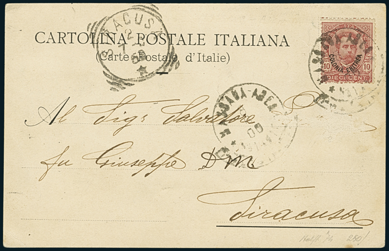 MASSAUA-ADEN/NATANTE. Su cartolina postale dell’8 giugno 1900 per Siracusa, affrancata con 10c. di Eritrea (15), annullo ripetuto a lato. Rara.