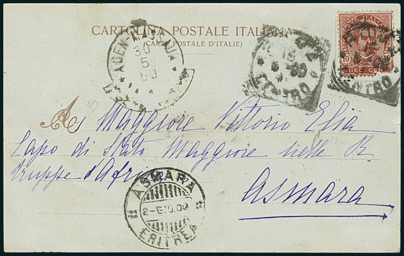 ADEN-MASSAUA/NATANTE. Apposto in arrivo su cartolina da Roma del 15 maggio 1900 per Asmara, a lato di 10c. d’Italia (60). Bollo del natante del 30 maggio e di arrivo del 2 giugno. Non comune.