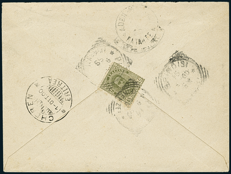 ADEN-MASSAUA/NATANTE. Apposto in arrivo su cartolina da Roma del 15 maggio 1900 per Asmara, a lato di 10c. d’Italia (60). Bollo del natante del 30 maggio e di arrivo del 2 giugno. Non comune.