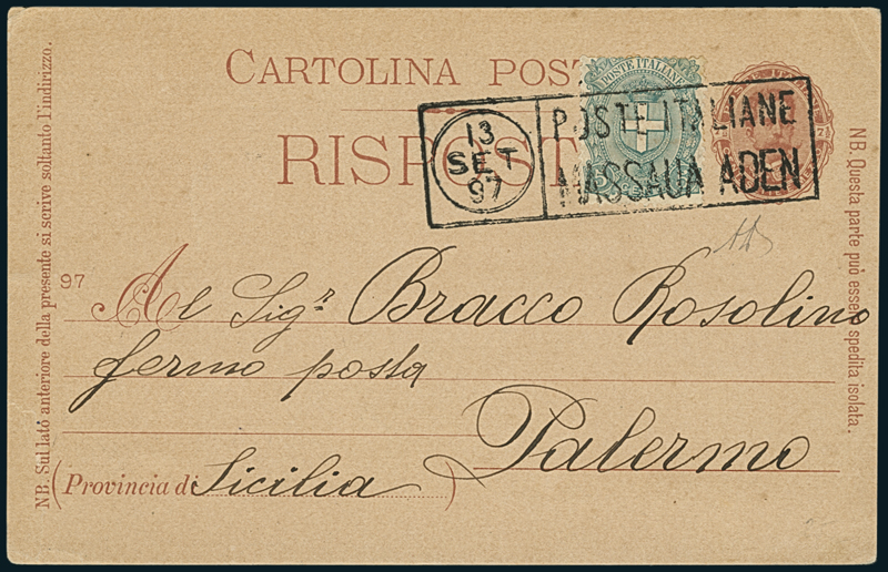 POSTE ITALIANE/MASSAUA ADEN. Su cartolina di risposta del 13 settembre 1897 per Palermo, da 7 1/2 c. con affrancatura aggiuntiva da 5c. d‘Italia (67). Raro annullo. AD.