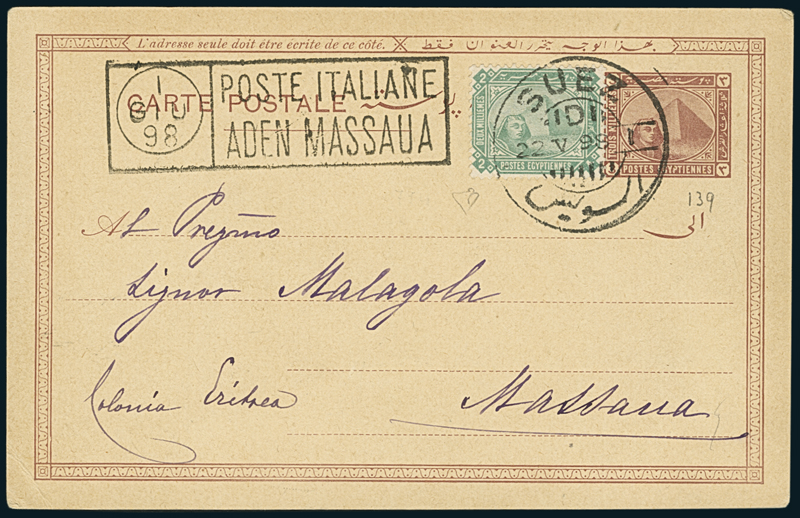 POSTE ITALIANE/ADEN MASSAUA. Su cartolina da 3 m. da Suez del 22 maggio 1898 per Massaua, con affrancatura aggiuntiva da 2 m., annullati col timbro di Suez. A lato il bollo in cartella con data di arrivo del 1° giugno. La cartolina fu trasportata da Suez ad Aden con un piroscafo della P. & O. e da Aden a Massaua con un sambuco della stessa Compagnia. Raro e interessante. Cert. E.D.