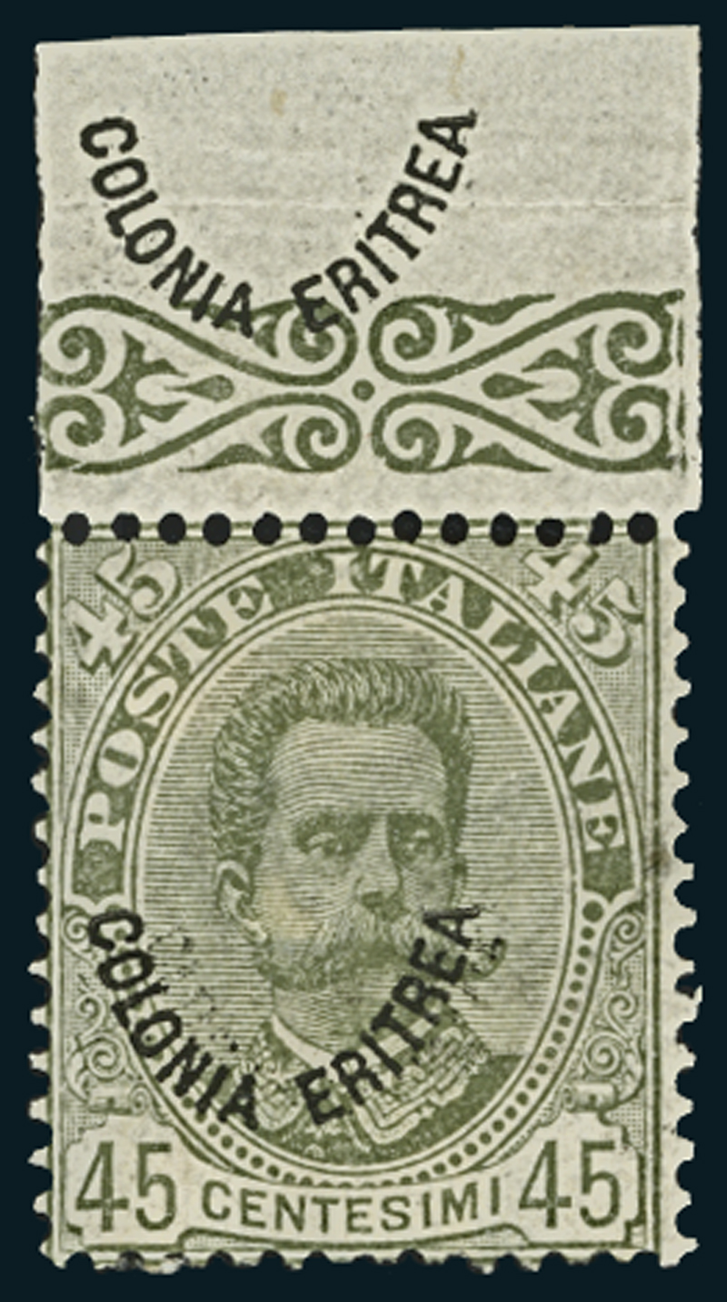 1895-99, 45 c. verde oliva, soprastampa spostata (18c) e ripetuta sul bordo di foglio recante in alto. Raro e non catalogato insieme. Firmato A. Diena.