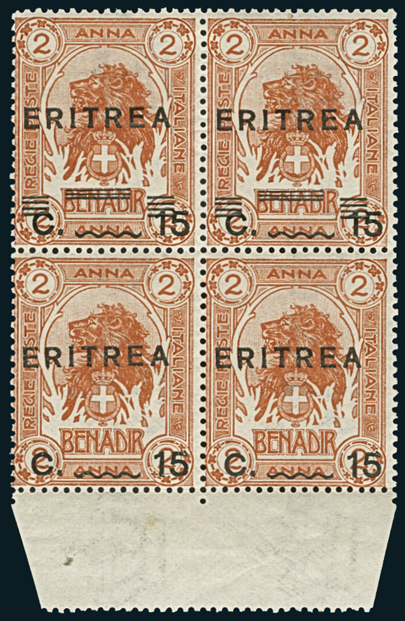 1922, Leone, 15 c. su 2 a. arancio bruno, blocco di quattro con due esemplari in alto recanti "Eritrea" e sbarrette fortemente spostate in senso verticale (57c), mentre gli altri due si presentano senza sbarrette (57d), con bordo di foglio. Firmato Em. Diena.