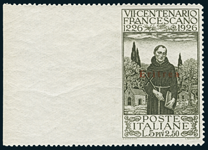 1926, San Francesco, 5 l. + 2,50 oliva, non dentellato a sinistra con bordo integrale di foglio (106a).