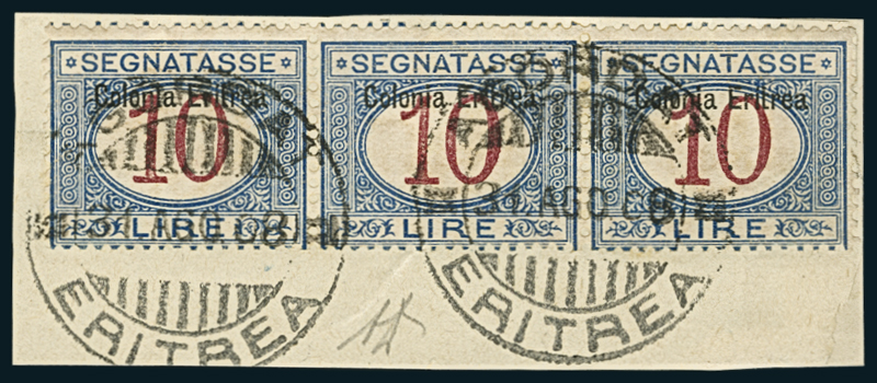 1903, segnatasse, 10 l. azzurro e carminio (11), striscia orizzontale di tre su piccolo frammento annullato "Agordat/31 Ago 08/Eritrea". Raro e molto bello. Firmato A. Diena.