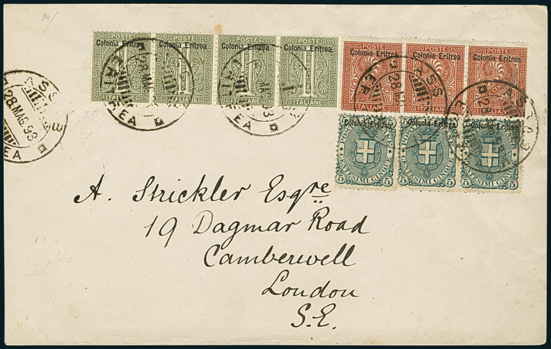 1893, busta da Assab del 28 maggio per Camberwell, Londra, affrancata per 15c. con striscia di quattro dell’1c., striscia di tre del 2c. e del 5c. (uno difettoso) (1, 2, 3), annullati col timbro a lunette “Assab/Eritrea”. Non comune destinazione all’estero, di ottimo aspetto.