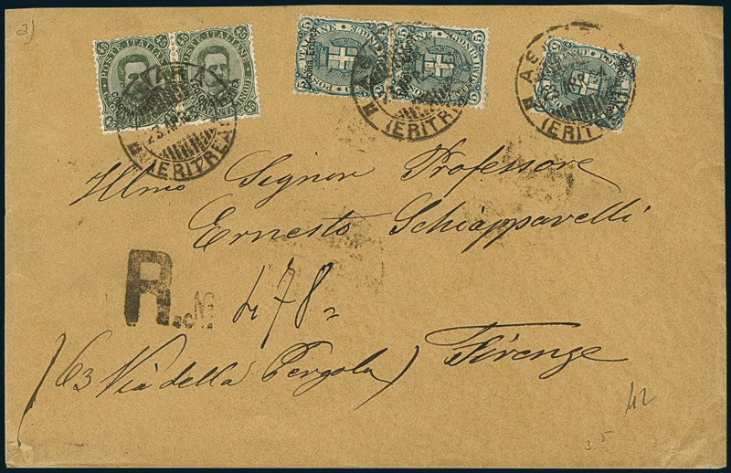 1894, raccomandata da Asmara del 23 aprile per Firenze, affrancata con tre esemplari del 5c. e due del 45c. (3, 8), annullati col timbro “Asmara/(Eritrea)”. Splendida, rara combinazione.