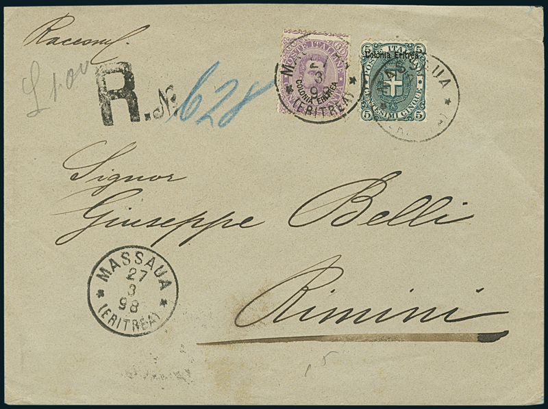 1898, raccomandata da Massaua del 27 marzo per Rimini, affrancata con 5c. e 60c. soprastampati (1, 9), annullati col bollo “Massaua/Eritrea” tipo 8. Bellissima.