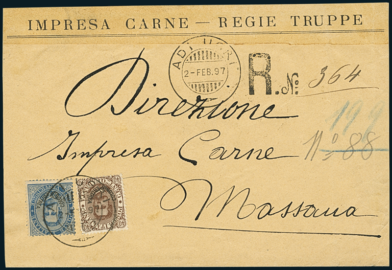 1897, raccomandata da Adi Ugri del 2 febbraio per Massaua, affrancata con fr. di Eritrea da 25c. e 40c. (6, 7). Molto bella.