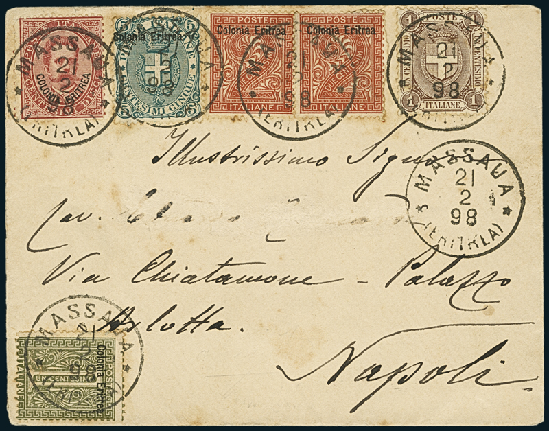 1898, bustina da Massaua del 21 febbraio per Napoli, affrancata con 1c. d’Italia (65) e cinque francobolli di Eritrea da 1c, due da 2c., 5c. e 10c. (1, 2, 3, 4). Non comune affrancatura mista.