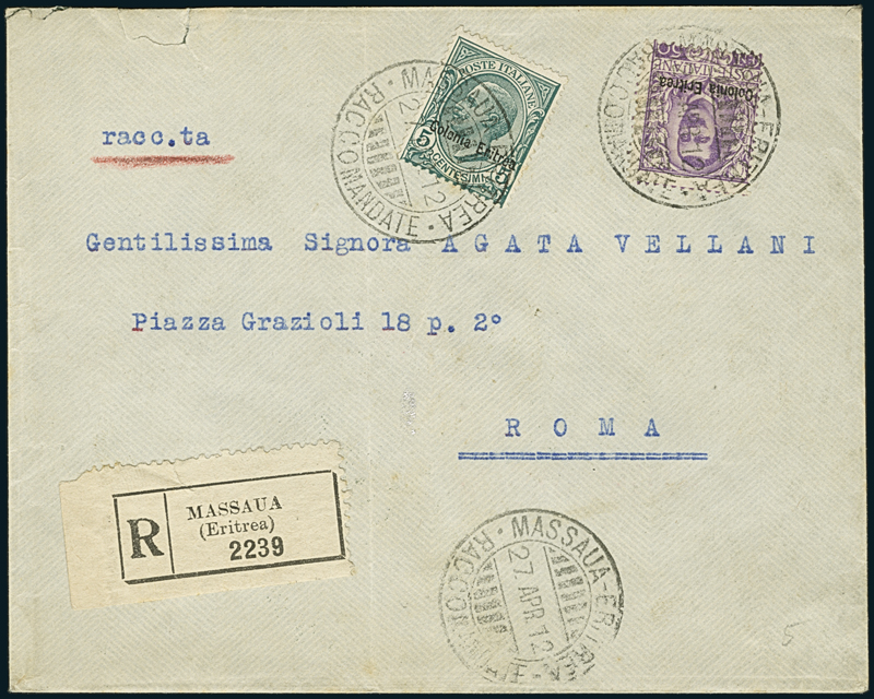 1912, raccomandata da Massaua dl 27 aprile per Roma, affrancata con 50c. e 5c. (27, 31), annullati col timbro “Massaua-Eritrea/Raccomandate” . Molto bella, rara affrancatura.