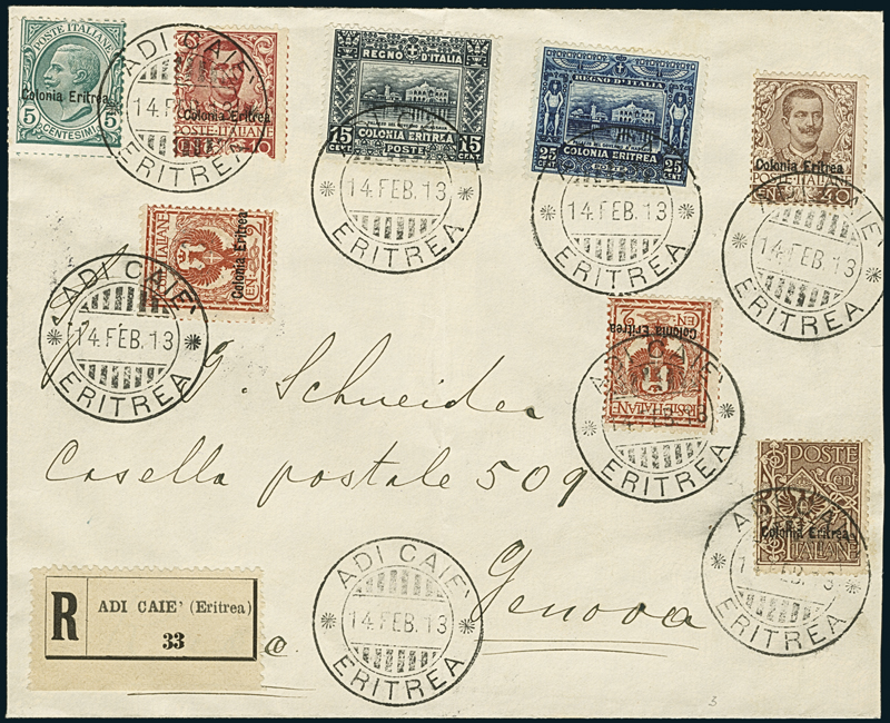1913, raccomandata da Adi Caiè del 14 febbraio per Genova, affrancata con fr. di Eritrea: 1c., due da 2c., 5c., 10c. 15c., 25c. e 40c. (19, 20, 22, 25, 31, 36, 37). Bolli di transito e arrivo al verso.