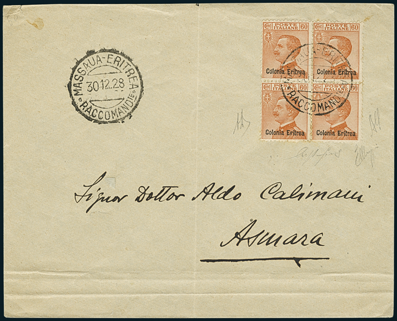 1928, busta da Massaua del 30 dicembre per Asmara, affrancata con blocco di quattro del 60c. (124), annullato col timbro “Massaua-Eritrea/Raccomandate”. Rara, alto valore. Firmata A.D., Fiecchi.