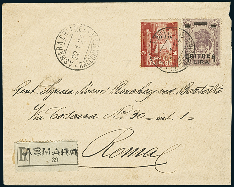 1924, raccomandata da Asmara del 22 gennaio per Roma, affrancata con soprastampati da 1l. su 10b. e 50c. Marcia su Roma (60, 67), annullati dal timbro “Asmara Eritrea/Raccomandate”. Molto bella.