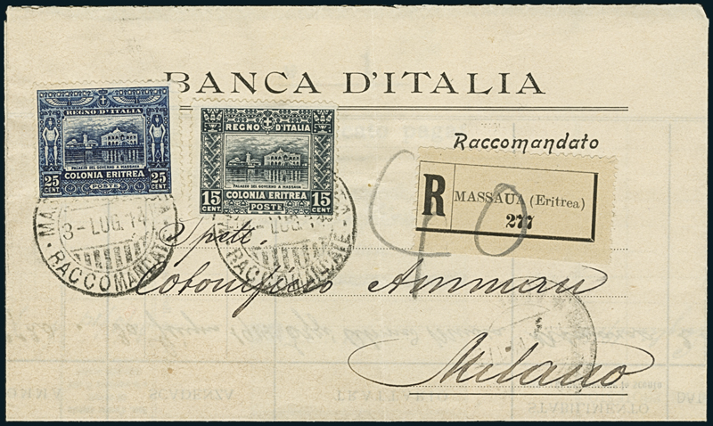 1914, raccomandata da Massaua del 3 luglio per Milano, affrancata con 15c. e 25c. (36, 37). Molto bella.