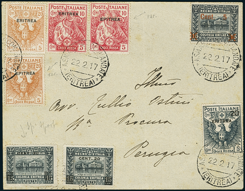 1917, busta da Asmara del 22 febbraio per Perugia, affrancata con due esemplari Croce Rossa da 10c., uno con varietà “Epitrea”, due es. del 20c., uno con la stessa varietà, un 20c (41, 41f, 44, 44f, 42) e tre valori francobolli soprastampati ad Asmara da 5 su 15c., e due da 20 su 15c uno con sopr. spostata in alto (45, 46, 46e). Interessante combinazione di tre varietà, alto valore.