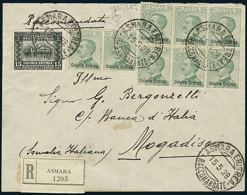 1928, raccomandata da Asmara del 15 maggio per Mogadiscio, affrancata con un 15c. e otto es. del 20c. (36, 93) in tariffa da lire 1,75. Alto valore, molto bella.