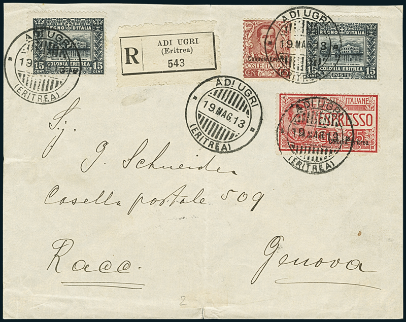1913, raccomandata da Adi Ugri del 19 maggio per Genova, affrancata con fr. di Eritrea da 10c. (22), due da 15c. (36), e espresso da 25c. (1). Molto bella.