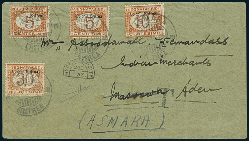 1906, busta da Hyderabad (India) per Aden, non affrancata, reindirizzata ad Asmara, tassata in arrivo il 2 ottobre per 50c. con segnatasse di Eritrea da 5c. (due), 10c. e 30c. (1, 2, 4) annullati col bollo “Asmara/Eritrea” tipo 7. Rara provenienza, pregevole combinazione.