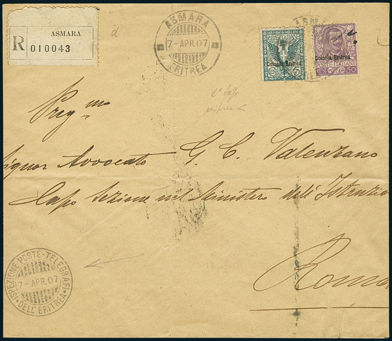 ASMARA. Raccomandata del 7 aprile 1907 per Roma, affr. con fr. di Eritrea da 5c e 50c. (21, 27), annullati col bollo “Asmara/Eritrea”. A lato e ripetuto al verso, bollo non segnalato e non conosciuto dai cataloghi “Ispezione Poste-Telegrafi/Dell’Eritrea” probabilmente apposto dallo stesso ufficio di Asmara. Molto rara.