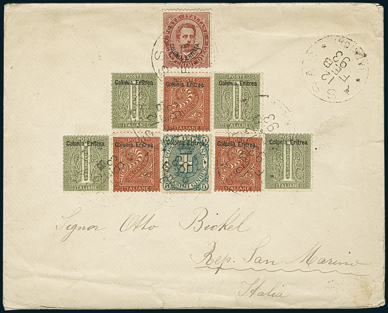 ASSAB. Busta del 12 febbraio 1893 per San Marino, affrancata con nove esemplari della I emissione di Eritrea: quattro da 1c., tre da 2c., uno da 5c. e uno da 10c. (1, 2, 3, 4) in composizione “a piramide” in tariffa da 25c., annullati col timbro “Assab/Africa” del tipo 4 (p. 8). Filatelica, ma bellissima e raro annullo.