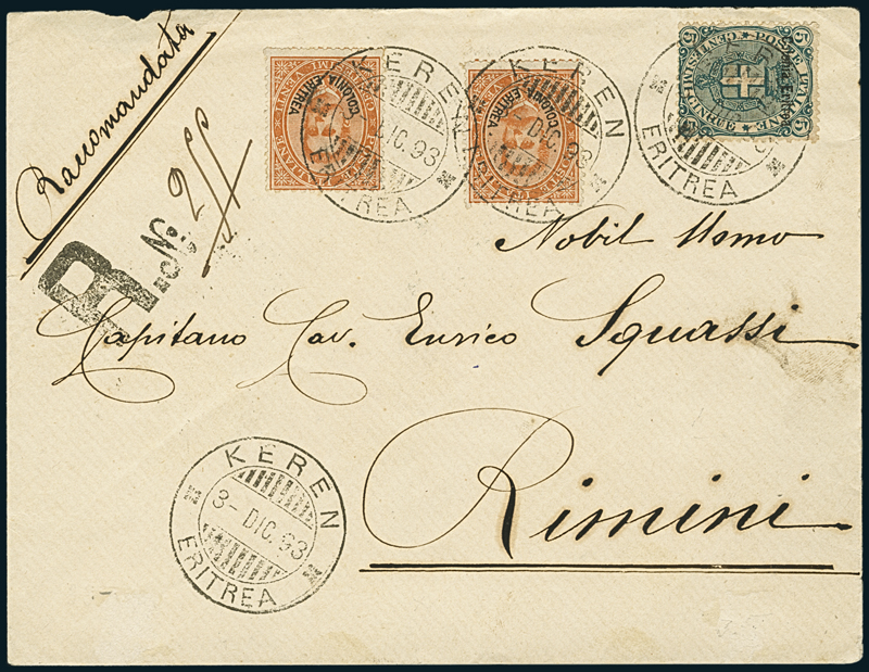 KEREN. Raccomandata primo porto del 3 dicembre 1893 per Rimini, affrancata con tre es. di Eritrea da 5c. e due da 20c. (3, 5), annullati col bollo “Keren/Eritrea” (AISP 2° tipo). Molto bella.
