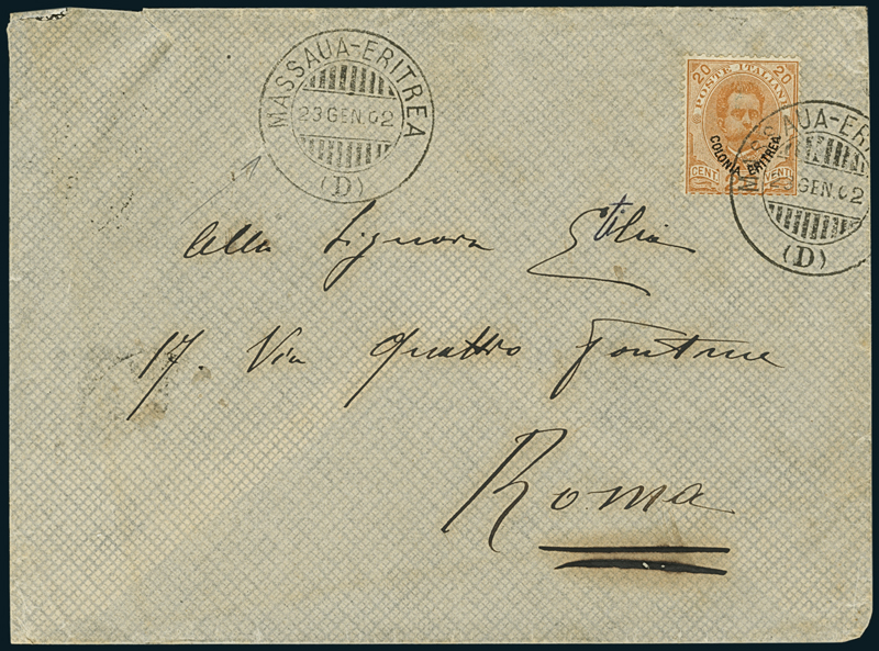 MASSAUA. 1896/1903. Annulli a due cerchi e lunette “Massaua/Eritrea/(A)” su cartolina con 2c (20); “Massaua/Eritrea/(B)” su cartolina con 2c. (20); “Massaua/Eritrea/(C)” su frammento con 2c. (2); “Massaua/Eritrea/(D)” su busta con 20c. sopr. (16). Questi timbri furono utilizzati dall’Ufficio Postale di Massaua ad uso interno, ma casualmente utilizzati anche per annullare corrispondenza privata (P. Bianchi, Colonia Eritrea, pag. 64). Raro insieme.