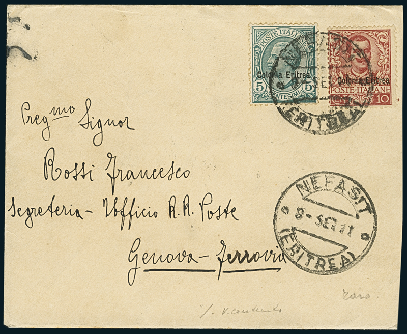 NEFASIT. Busta per Genova, affrancata con francobolli di Eritrea da 5c. e 10c. (22, 31), annullati col timbro “Nefasit/(Eritrea)-8 Sett.1911”. Il mittente, un miliare impiegato nel servizio telegrafico, comunica ad un suo superiore a Genova il suo nuovo incarico e la sua felicità nello svolgere questa mansione: “La Direzione di Asmara mi ha destinato a titolare della collettoria postale ed ufficio telefonico di Arbaroba, piccola frazione di Asmara, ove attualmente (e per poco tempo ancora) risiede un ufficio speciale per la costruzione dell’ultimo tratto della ferrovia Massaua-Asmara…". Molto interessante.