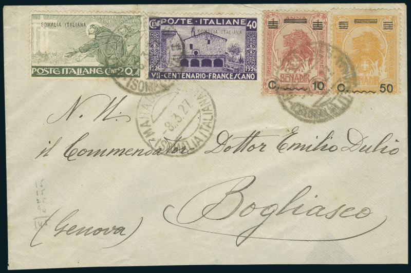1927, busta dell'8 marzo per l'Italia, recante 10c. su 1a. e 50c. su 5a. (75, 79), e San Francesco 20c. e 40c. (81, 82), con annullo di Mahaddei Uen (p. 7).