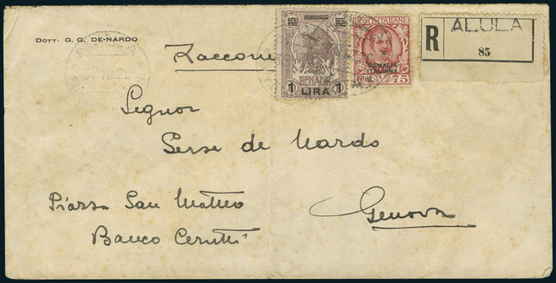 1929, raccomandata del 30 dicembre per Genova, affrancata con 1l. su 10a. (80) e 75c. (98), con annullo "Alula/Somalia Italiana" (p. 7).