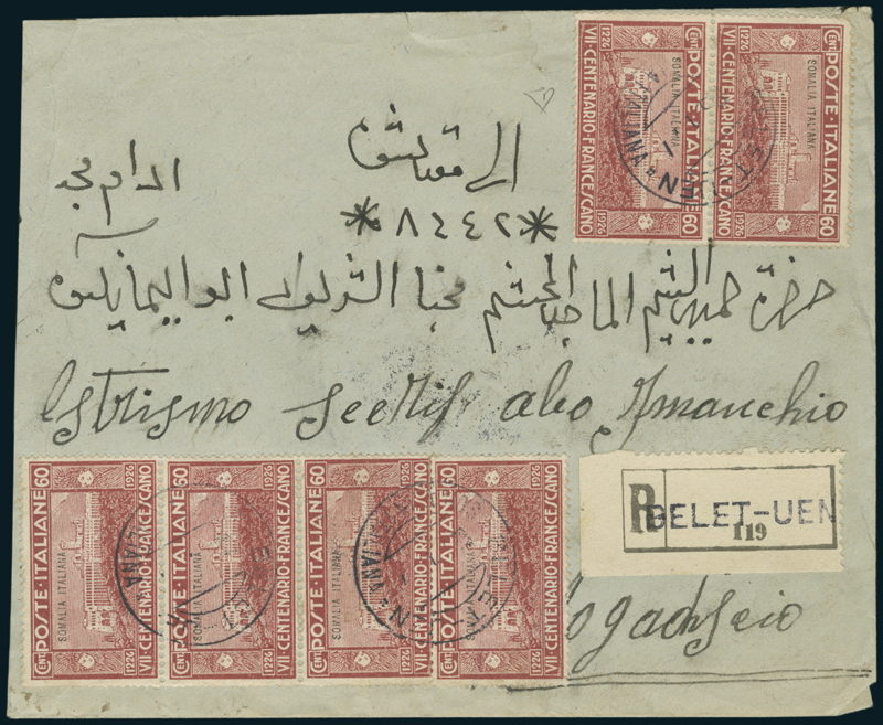 1927, raccomandata nativa per Mogadiscio, affrancata con San Francesco 60c. (83), sei esemplari, 20c. (81) applicato al verso, annullati "Belet-Uen/Somalia Italiana" (p. 7). Rara affrancatura multipla. Firmata Enzo Diena.