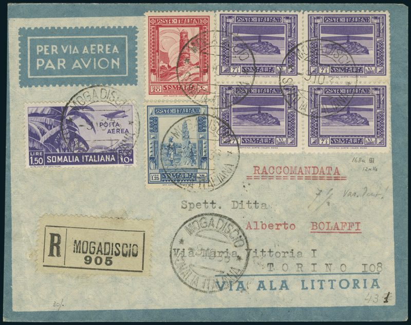 1936, raccomandata da Mogadiscio del 9 ottobre per Torino, recante "Pittorica" 7 1/2c., dentellatura mista 12x14 (168a) in blocco di quattro, 20c. ed 1,25l. (171, 177), più P.A. 1,5l. (22), con arrivo al verso. Varietà molto rara su lettera.