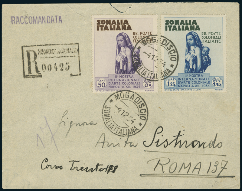 1934, raccomandata da Mogadiscio per Roma, recante "Mostra Coloniale" 50c. ed 1,25l. (196, 198). Affrancatura rara in tariffa.