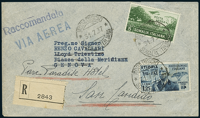 1937, raccomandata via aerea da Mogadiscio del 31 luglio per l'Italia, recante un 5l. di posta aerea (25), in combinazione con Etiopia 1,35l. (7). Affrancatura non comune.