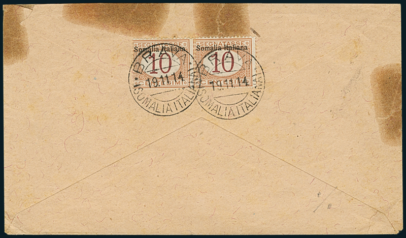 1914, lettera da Chisimao sotto sovranità inglese del 15 novembre per Brava, con annullo "Kismayu/E.A.P.", tassata con ottogonale "T/Cents", riscossa al verso con coppia di segnatasse soprastampati da 10c. (13), annullata "Brava/(Somalia Italiana)".