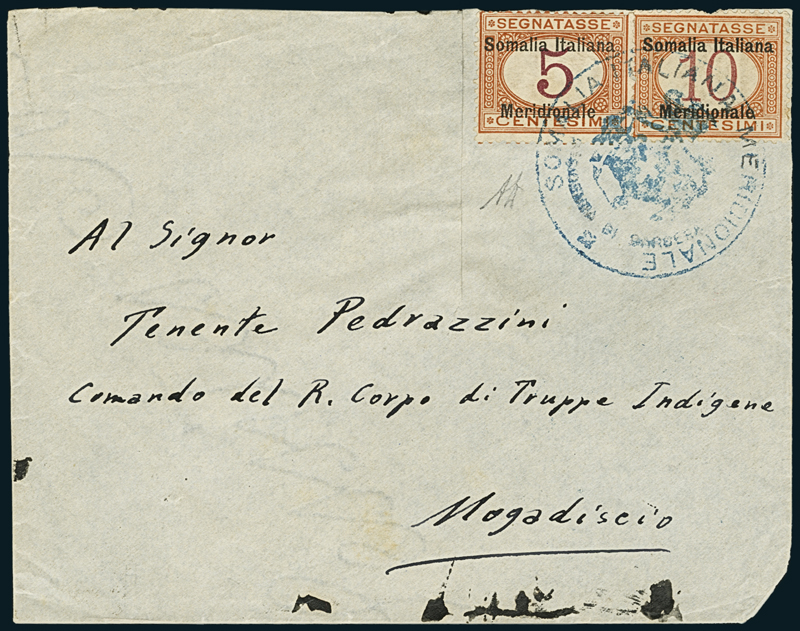 BARDERA. Frontespizio di lettera per il Comando del R. Corpo di Truppe Indigene a Mogadiscio, con affrancatura di emergenza composta da due segnatasse soprastampati da 5c. e 10c. (1, 2), annullato con bollo residenziale "Somalia ItalianaMeridionale/Residenza di Bardera" in azzurro (p. R). Rarissimo annullo impreziosito dall'interessante affrancatura. Firmato A. Diena.