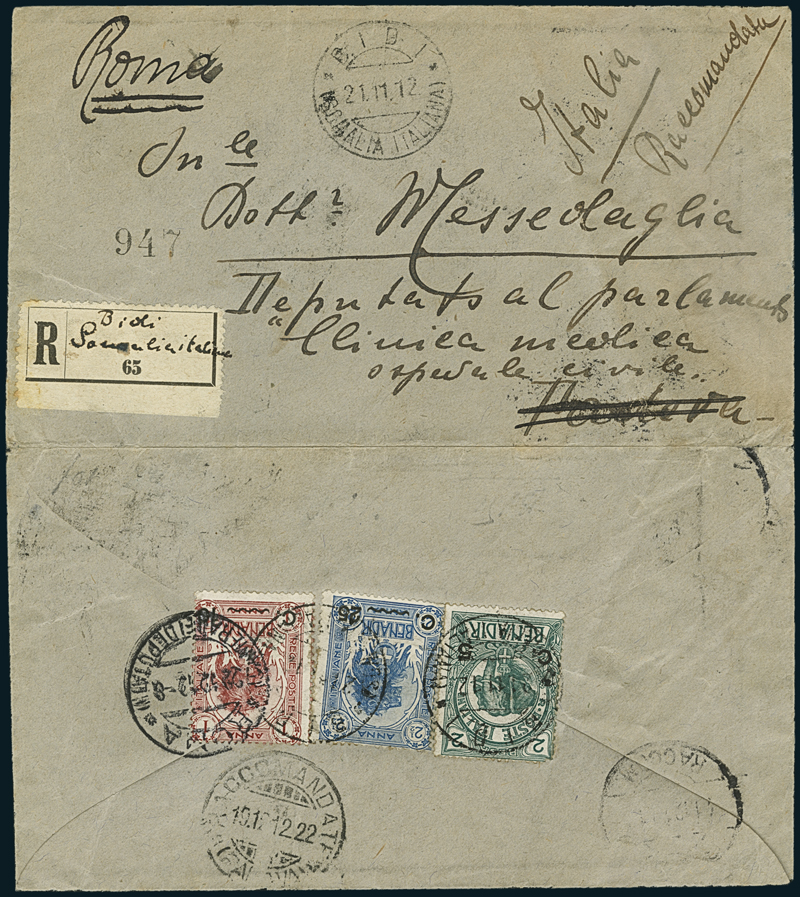 BIDI. Raccomandata per l'Italia affrancata con 5 c. su 2 b., 10 c. su 1 a. e 25 c. su 2 1/2 a. (11, 12, 14), con annullo"Bidi/(Somalia Italiana)/21.11.12" (p. RRR, e prima data nota), ed uso provvisorio manoscritto sul talloncino di raccomandazione. Il 10 c. è anche interessato dall'annullo della camera dei deputati di Roma. Illustrata a pagina 149 nel libro di Paolo Bianchi. Solo quattro lettere note di quest'ufficio, e questa è notevolmente impreziosita dall'uso raccomandato, unico, e l'affrancatura tricolore. Una delle importantissime rarità storico-postali della Somalia. Ex Bianchi.