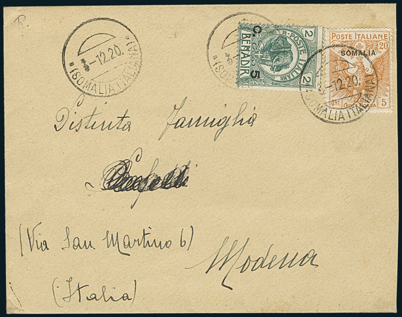 BUGDA. Busta per l'Italia, affrancata con 5 c. su 2 b. (11) e 20 c.+ 5 c. (22), con annullo muto " /(Somalia Italiana)/3-12.20" (p. R). Di fascino.