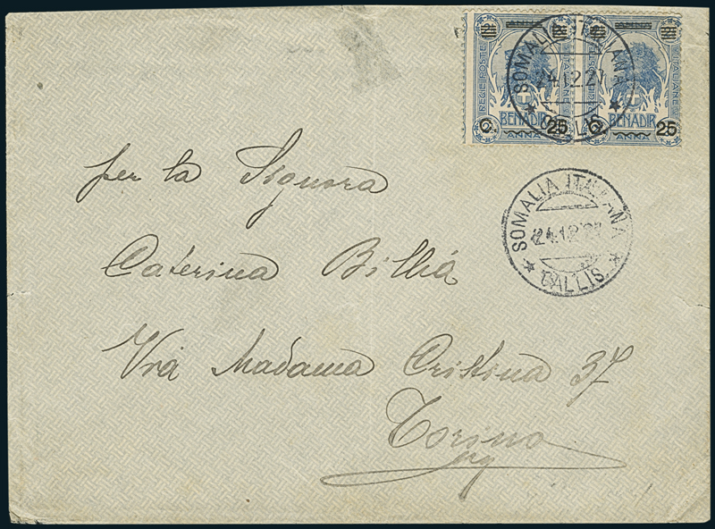 CALLIS. Busta per Torino affrancata con coppia di 25c. su 2 1/2a. (78), annullata con timbro "Somalia Italiana/Callis/24.12.27" (p. R), ripetuto in basso.