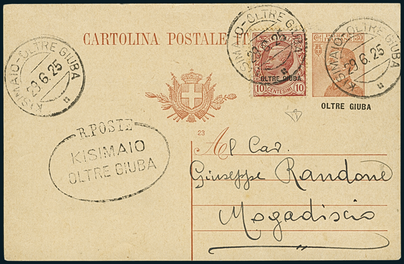CHISIMAIO. Intero postale per Mogadiscio da 30 c. soprastampato "Oltre Giuba" (Pertile 1), con affrancatura supplementare da 10 c., annullati con "Kisimao-Oltre Giuba/29.6.25" ed a lato rarissimo ovale "R. Poste/Kisimaio/Oltre Giuba" (p. =). Interessantissimo testo al verso "Nel momento in cui su questa bella terra d'Oltre Giuba garnisce festoso il nostro tricolore ed inizia il servizio postelegrafonico". Insieme straordinario. E.D.