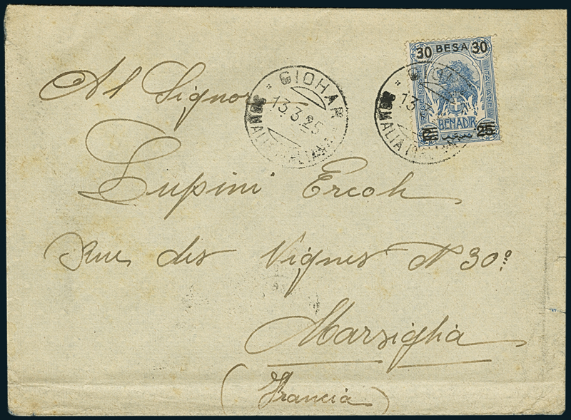 GIOHAR. Lettera per la Francia affrancata con 30 b. (42), annullato con "Giohar/Somalia Italiana (p. R).