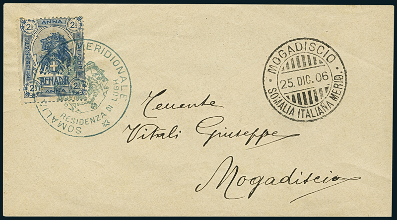 LUGH. Busta per Mogadiscio recante un 2 1/2 a. (5), annullato nitidamente con "Somalia Italiana Meridionale/Residenza di Lugh" con stemma e bollo a data di Mogadiscio (25.12.06) a destra. Splendida.
