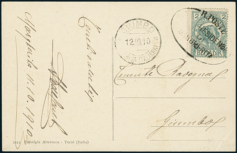 MARGHERITA. Cartolina per Giumbo affrancata con 2 b. (2), con bell'impronta dell'ovale residenziale "R. Poste/Residenza di Margherita" ("Vice" elliminato, p. RR), ed arrivo a lato (12.10.10). Molto rara.