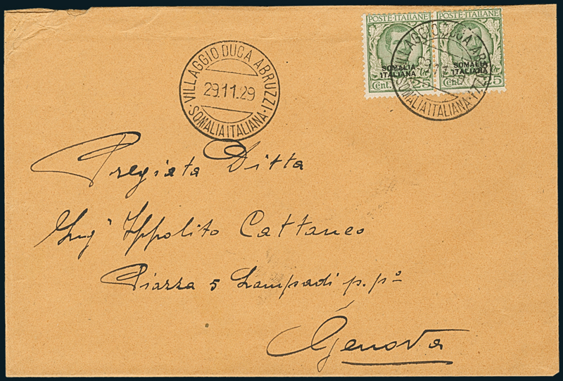 VILLAGGIO DUCA ABRUZZI. 1929-32, due lettere, una affrancata con 20 c. e 30c. (95, 96A) con l'annullo I tipo (p. 6), l'altra affr. con coppia del 25c. (96) annullata con il secondo tipo (p. 7).